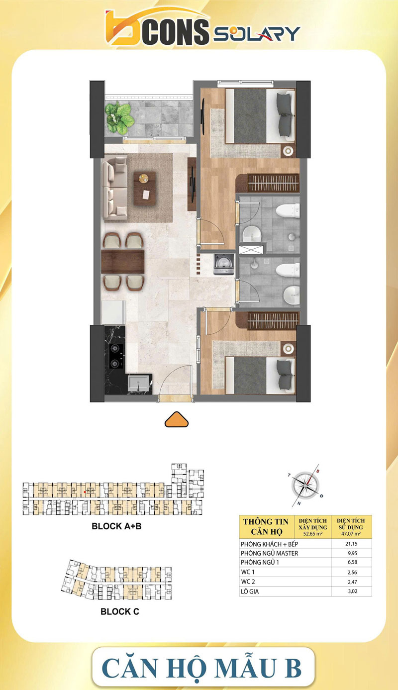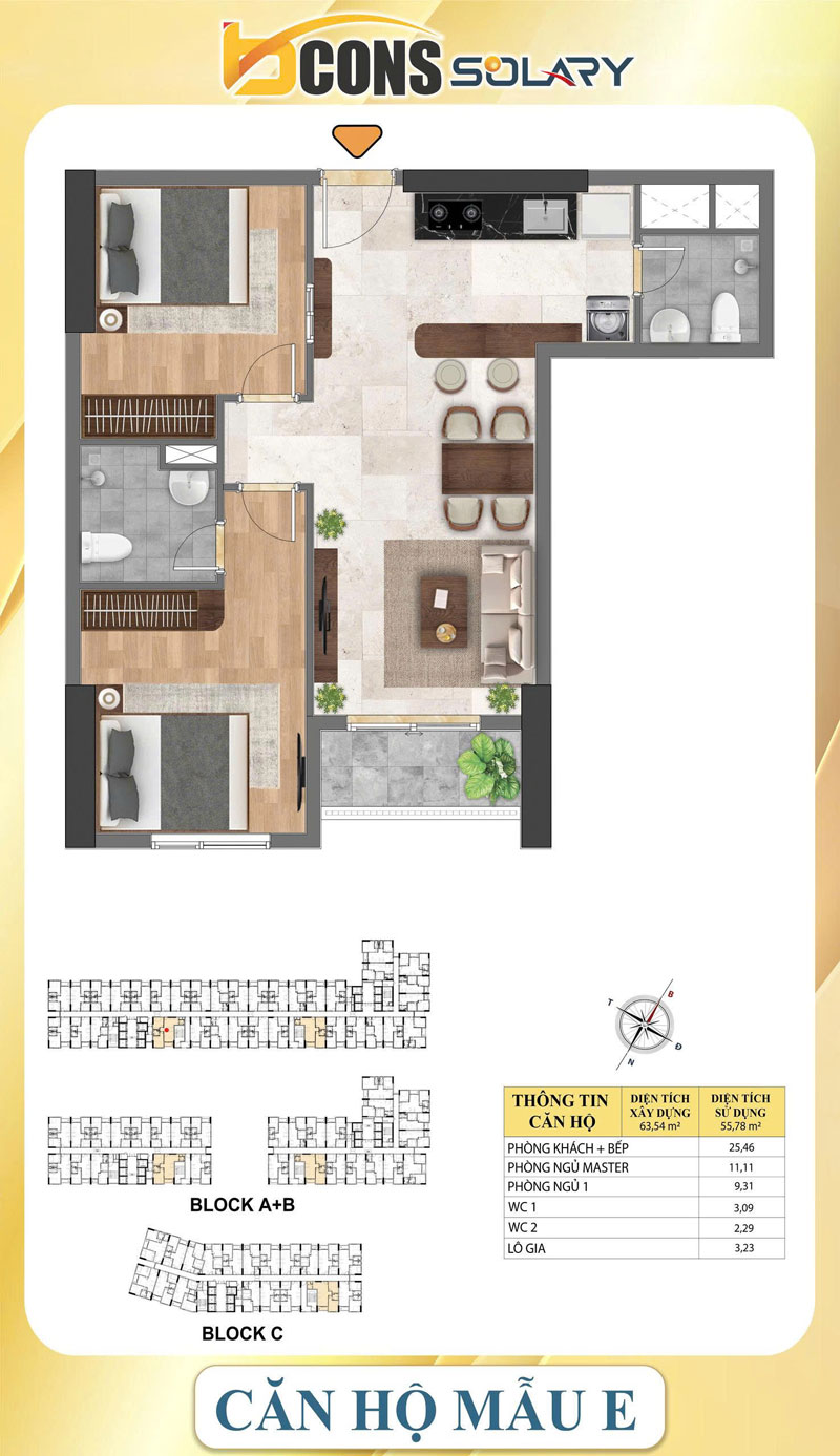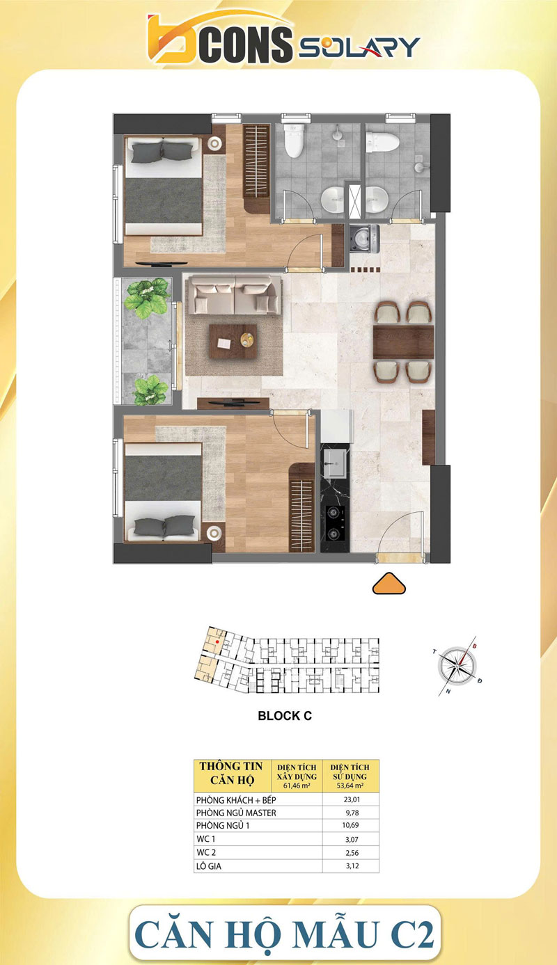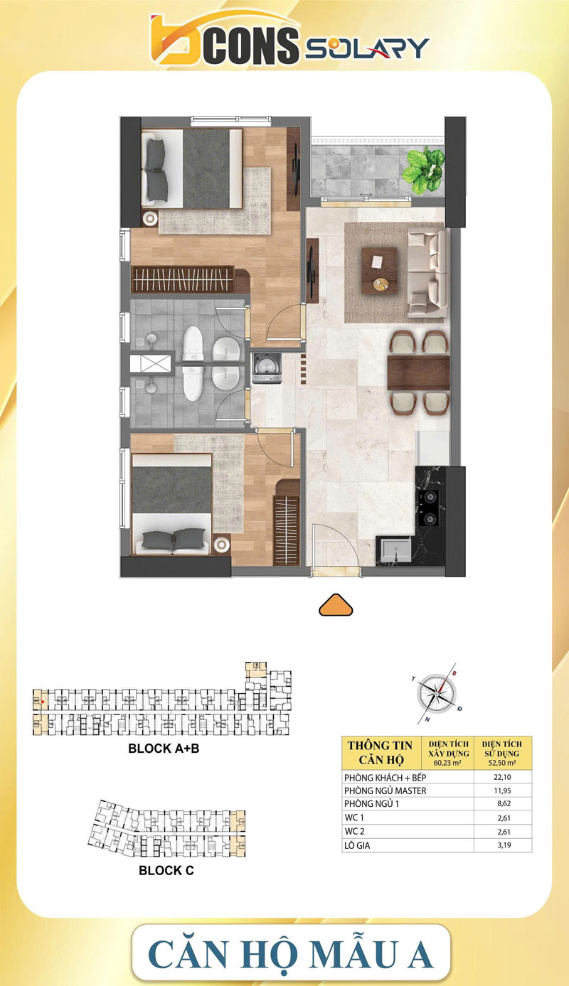 Căn thường Bcons Solary diện tích 52 – 54m2 thiết kế 2 WC sẽ không có cửa sổ, phòng ngủ phụ sẽ có cửa sổ nhìn ra bếp